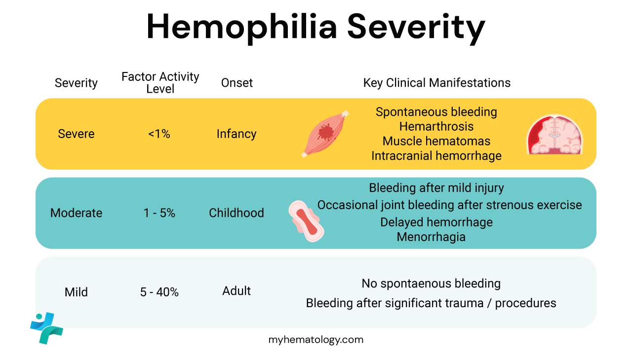 In addition to type, hemophilia is universally classified by severity, which directly correlates with the amount of functional clotting factor activity present in the patient’s plasma. Both deficiencies result in defective thrombin generation, leading to an inability to form a stable fibrin clot at the site of vascular injury.