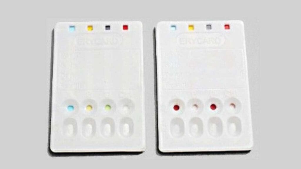 - Results in: Approximately 2 minutes, with visible agglutination indicating the blood type.