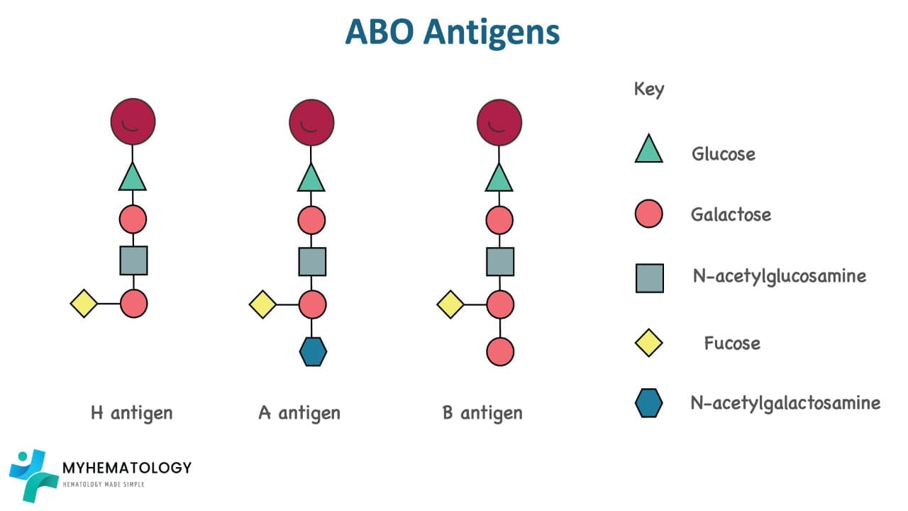 The H antigen is a precursor antigen that is present on the surface of all RBCs. It is synthesized from glucose molecules by a series of enzymatic reactions. The ABO glycosyltransferase enzymes add the final sugar molecule to the H antigen to produce the A, B, or O antigen.